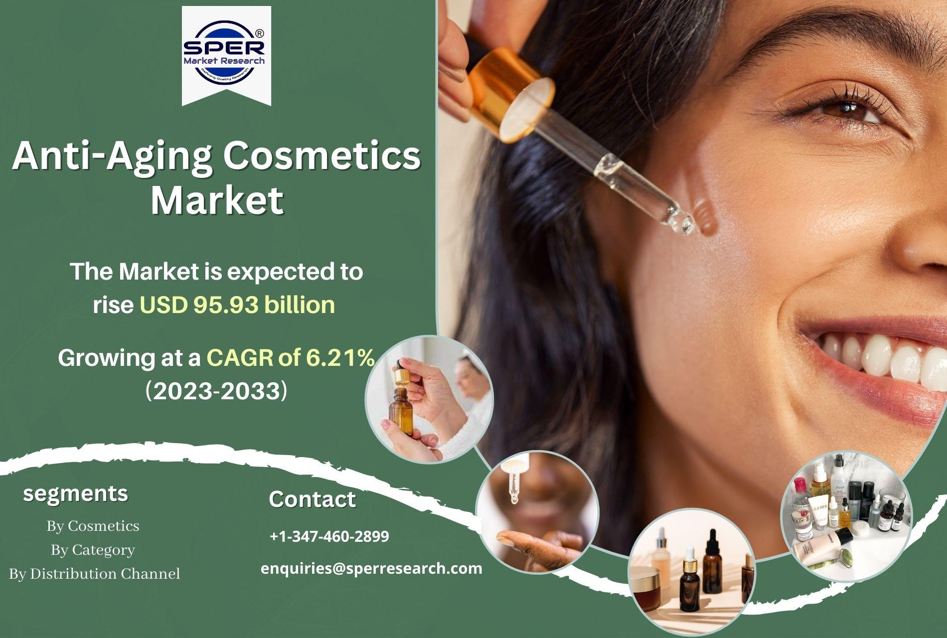According to SPER market research, ‘Anti-Aging Cosmetics Market Size– By Product, By End User, By Distribution Channel- Regional Outlook, Competitive Strategies and Segment Forecast to 2033’ state that the Global Anti-Aging Cosmetics Market is predicted to reach USD 95.93 billion by 2033 with a CAGR of 6.21%.