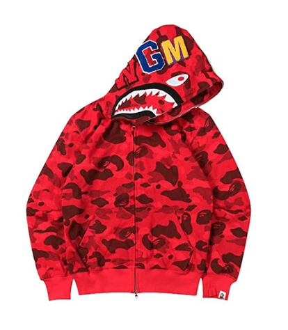 - Shark Hoodie: This is one of Bape’s most iconic designs, featuring a shark face on the hood with a zippered mouth. The hoodie also has a camo pattern and Bape’s signature ape logo.