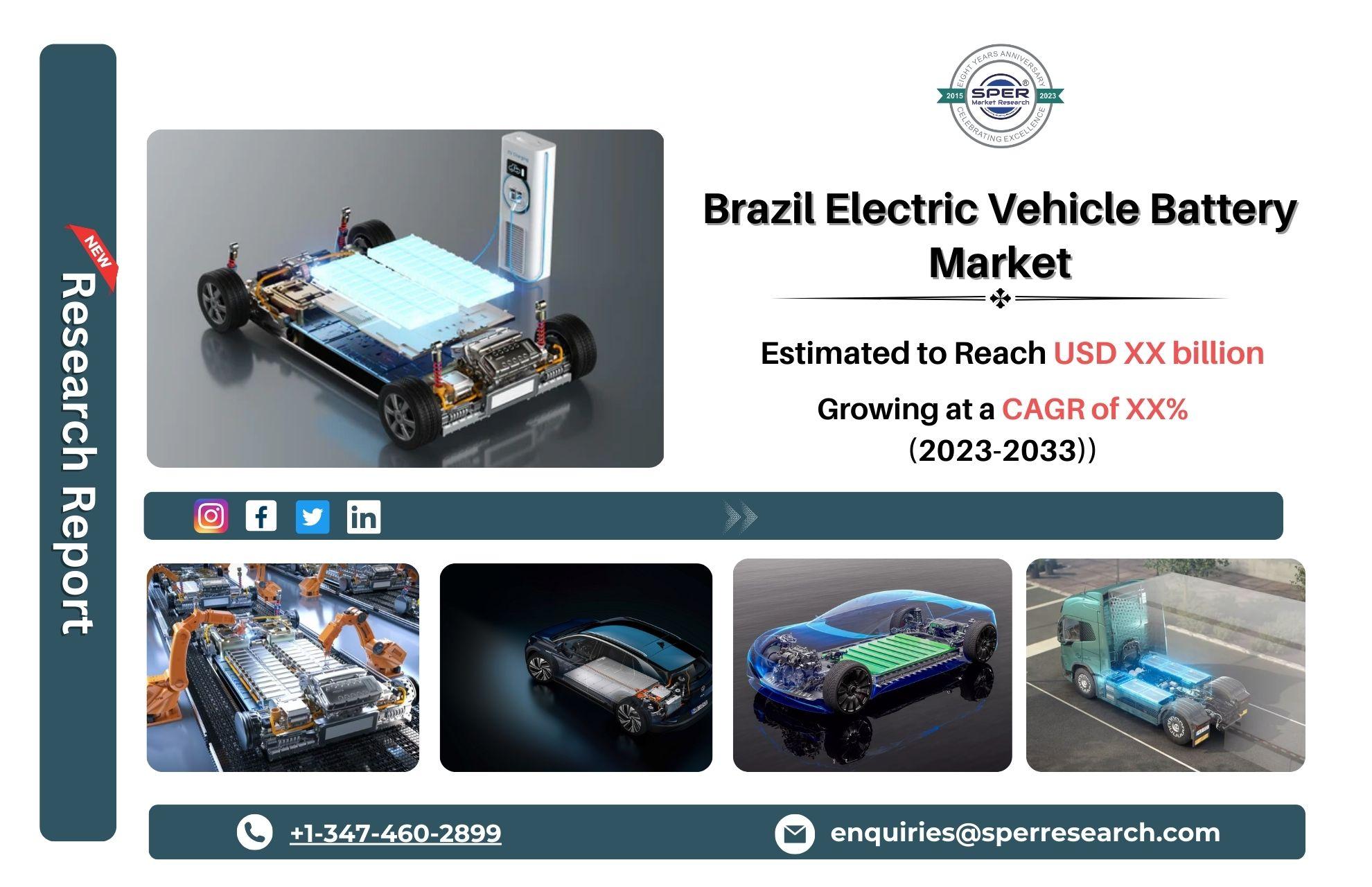 According to SPER market research, ‘Brazil Electric Vehicle Battery Market Size-By Vehicle Type, By Propulsion, By Battery Type, By Distribution Channel-Regional Outlook, Competitive Strategies and Segment Forecast to 2033’state that the Brazil Electric Vehicle Battery Market is predicted to reach USD XX billion by 2033 with a CAGR of XX%.