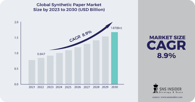 According to the latest SNS Insider report, The Synthetic Paper Market Size is anticipated to reach USD 1.67 billion by 2030, exhibiting a remarkable CAGR of 8.9% during the forecast period from 2023 to 2030. It was valued at USD 0.847 billion in 2022. The synthetic paper market is witnessing significant growth propelled by its versatility, durability, and eco-friendly characteristics, making it a preferred alternative to traditional paper in various applications. Synthetic paper, manufactured from synthetic resin materials such as polypropylene (PP) or polyethylene (PE), offers superior resistance to water, chemicals, tearing, and fading compared to conventional pulp-based paper. This makes it ideal for applications requiring durability and longevity, such as labels, tags, packaging, and signage. Additionally, synthetic paper is recyclable, tear-resistant, and resistant to moisture and chemicals, making it an environmentally friendly option compared to traditional paper products.